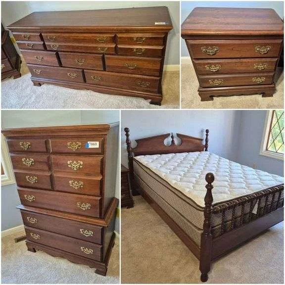 7060 Cherry bedroom set including dresser, chest of drawers, nightstand, and bed frame