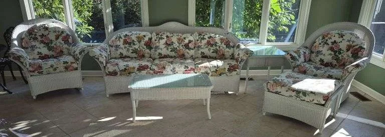 7008 Wicker furniture set including sofa, armchair, rocking chair, ottoman, coffee table, and table