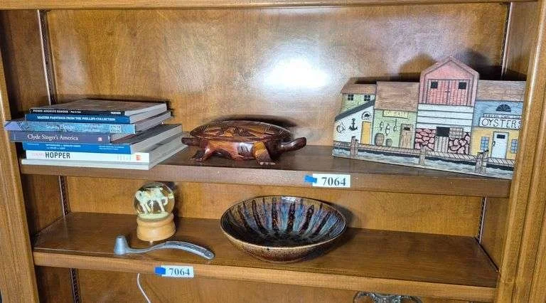 7064 Art books, wood carved covered turtle, studio pottery bowl, candle snuffer, carousel horse snow glob