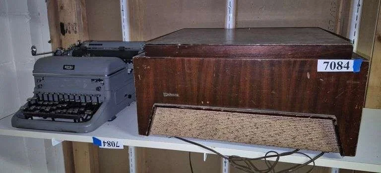 7084 Vintage record player/radio, vintage Royal manual typewriter