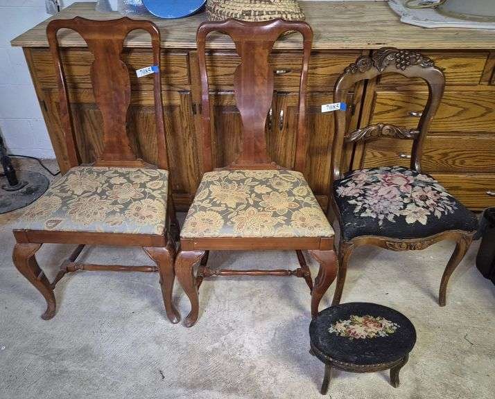 7085 Pair of cherry chairs, Victorian carved back chair with needlepoint seat, small needlepoint footstoo