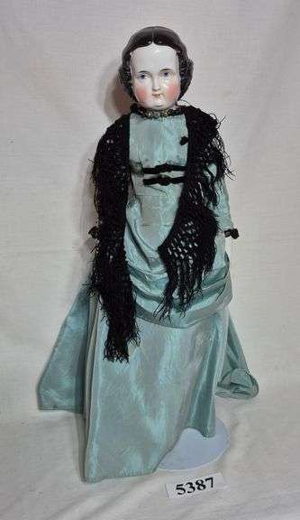 5387 Porcelain head doll in light blue dress