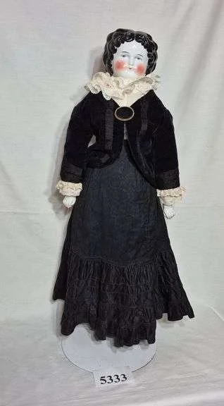 5333 Large porcelain head doll in black outfit