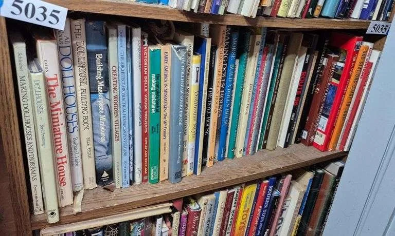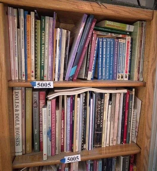 5005 Two shelves of books including doll books, dollhouse books, quilt, needlework, pattern books, Etc