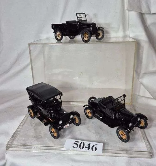 5046 The Danbury Mint 1925 Ford Model T Touring Car Ltd Ed., Model T, and Model T Runabout in plastic dis