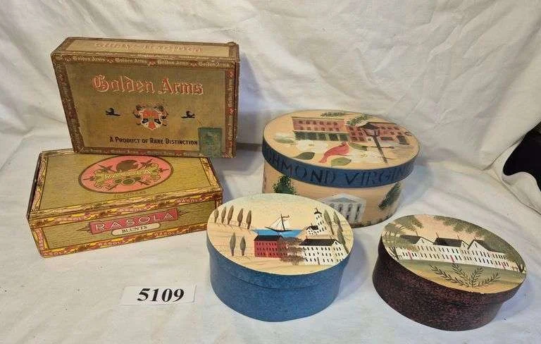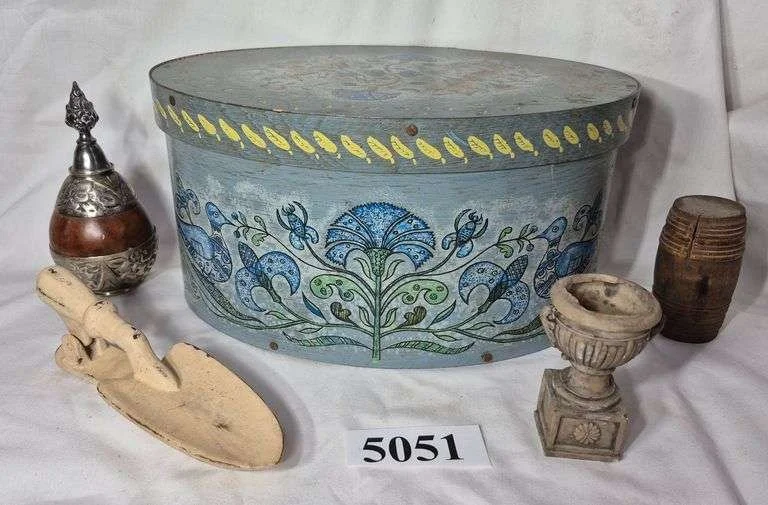 5051 Decorated oval wooden box, perfume bottle, door knocker, wood barrel container full of miniature clo