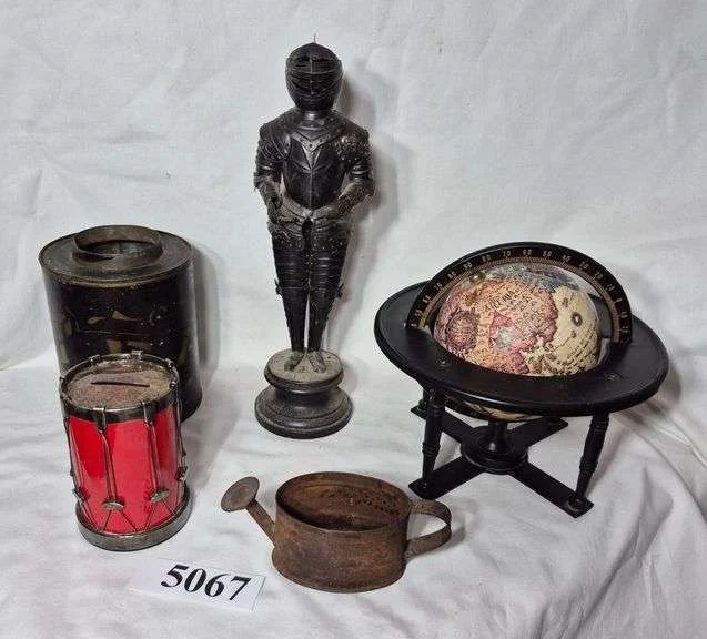 5067 Small metal globe, metal knight figurine, tea tin, drum bank, watering can