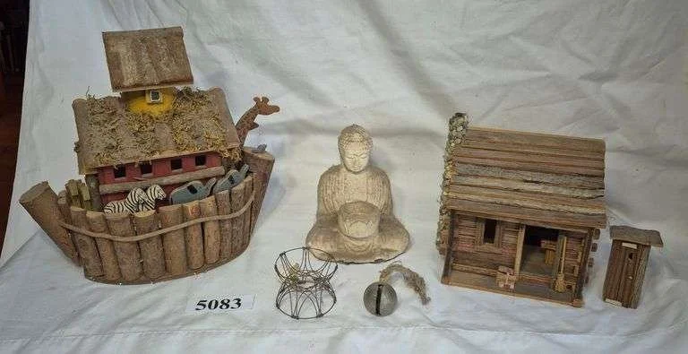5083 Wood Noah's Ark model, log cabin and outhouse, buddha, bell, etc.