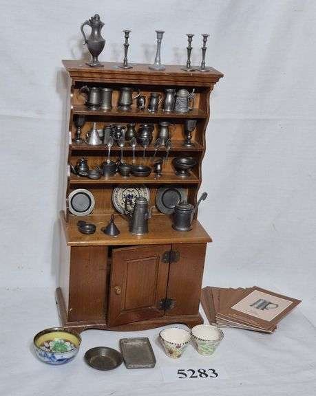 5379 Doll house sized pewter plates, miniature bottles, mixing bowls, milk bottles, rolling pin, butter p