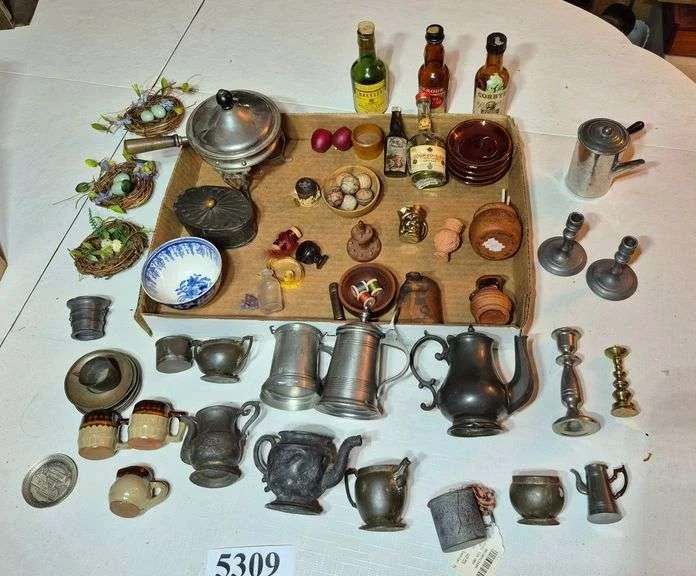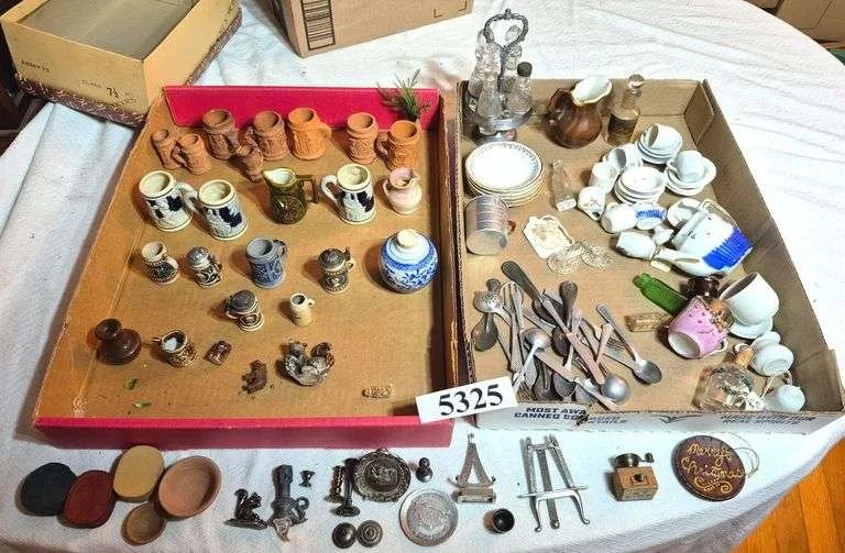 5325 Doll house sized steins, mugs, tea sets, Caster set, flatware, candlesticks, Etc