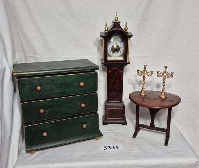 5341 Doll size green three drawer dresser, drop leaf table, candelabras, Bombay grandfather clock
