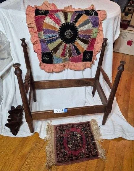 5373 Antique wood doll bed, doll sized crazy quilt, rug, corner shelf