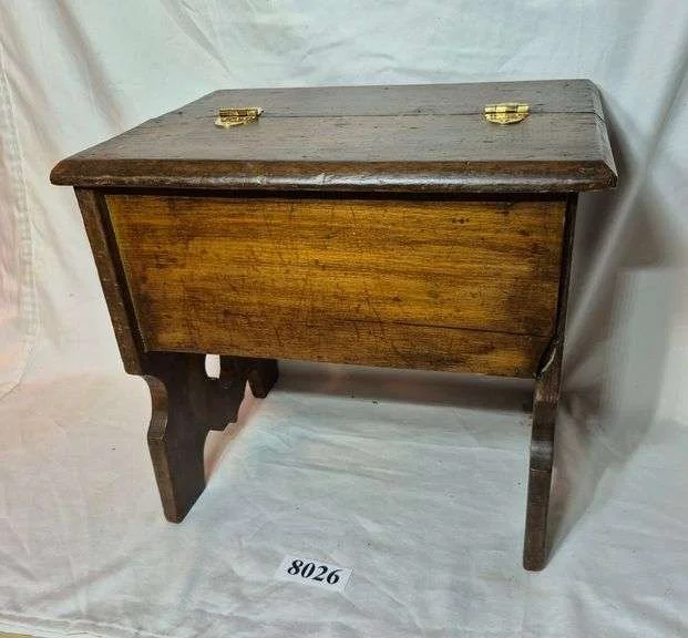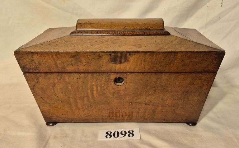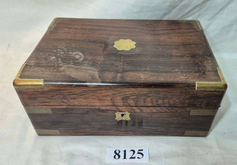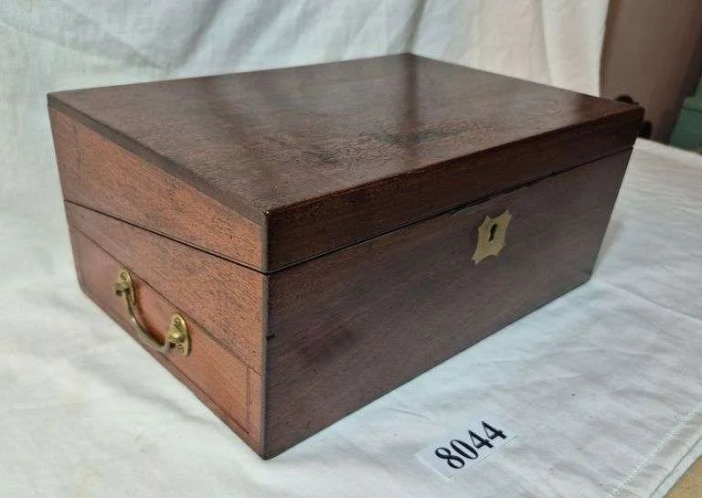 8044 Antique wood writing box with locking drawer, two ink wells with sterling lids