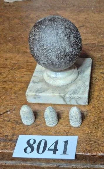 8041 Civil War era artillery ball on marble pedestal, three Minié balls.