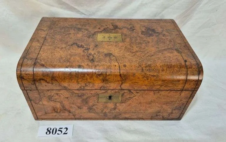 8030 Antique burled wood writing box with glass inkwells and dip pen