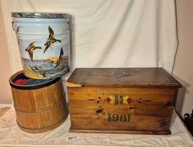 8072 Stencil decorated wood box, wood bucket, duck tin full of yarn and sewing supplies