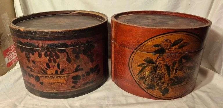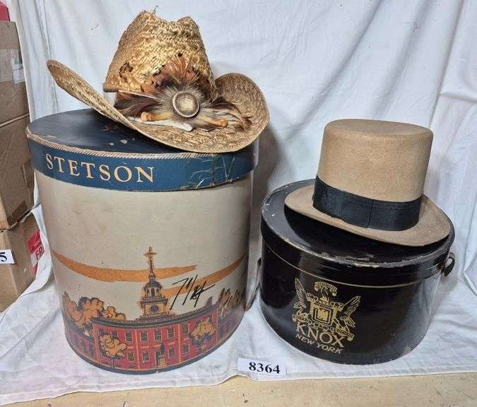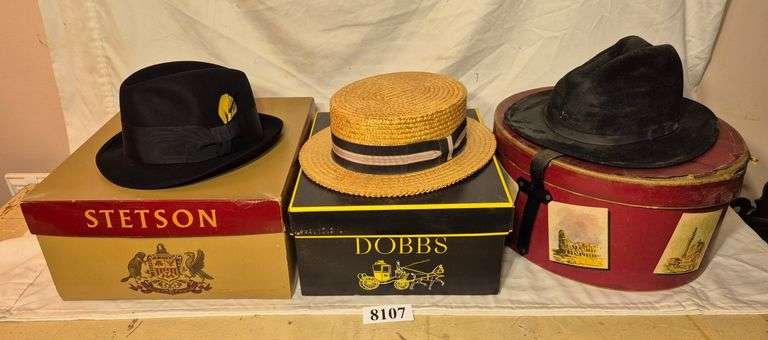 8373 Vintage Dobbs and Stetson bowler hats, vintage top hat, three vintage hat boxes