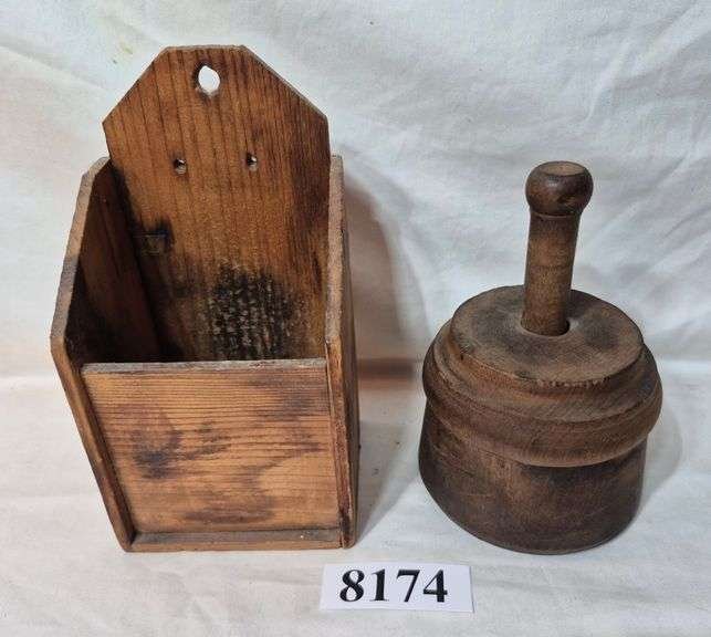 8406 Small powder horn, vintage camera, small wood totes, wall sconce, Etc