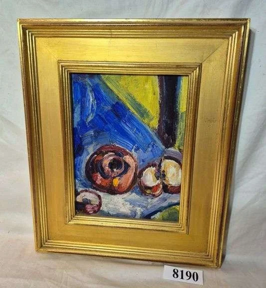 8049 Artist signed flower painting on board in antique gold gesso frame