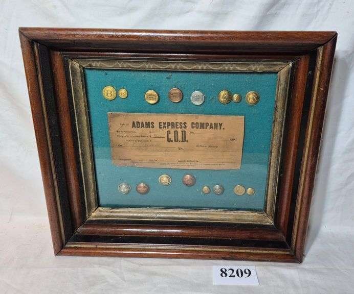 8015 Collection of brass tags, possibly employee badges, in antique deep Walnut frame