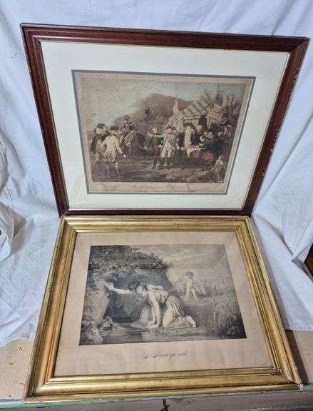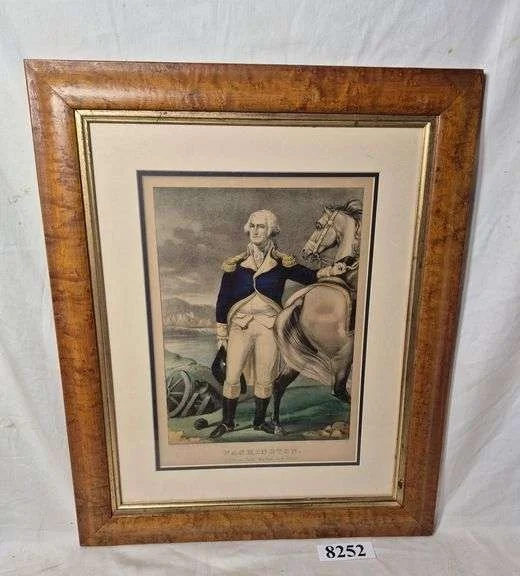 8336 Framed antique Washington at Rochambeau lithograph, framed monochrome French lithograph