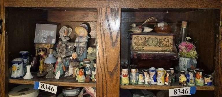 8346 Miniature Toby pitchers, miniature piano, miniature oil lamps, figurines, Etc