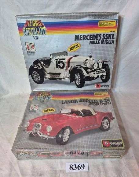 8369 Bburago Mercedes SSKL Mille Miglia and Lancia Aurelia B24 Spider metal diecast model kits in boxes