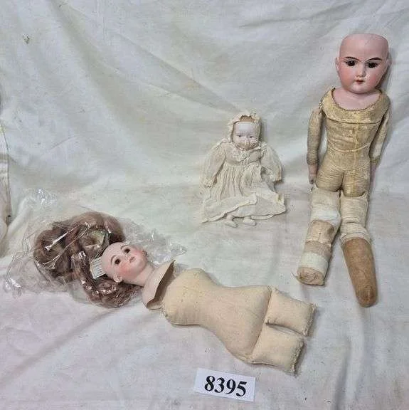 8371 Three bisque head dolls including antique doll in kit form with sleepy eyes