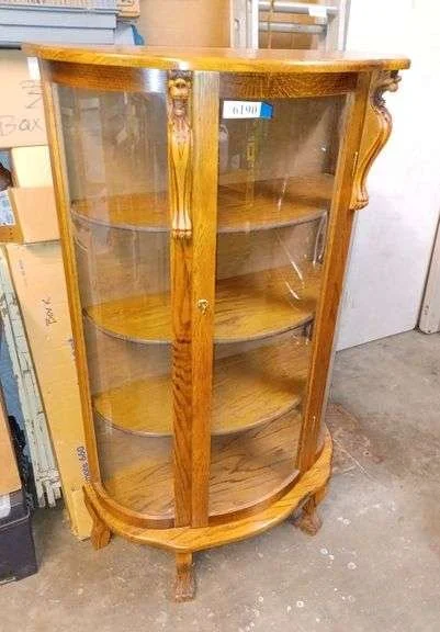 4112 Oak curved glass china cabinet with three shelves and key, with carved gargoyles and carved paw feet