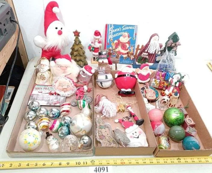 4097 Vintage Christmas ornaments, Santa figurines and candle holders, other Christmas decorations