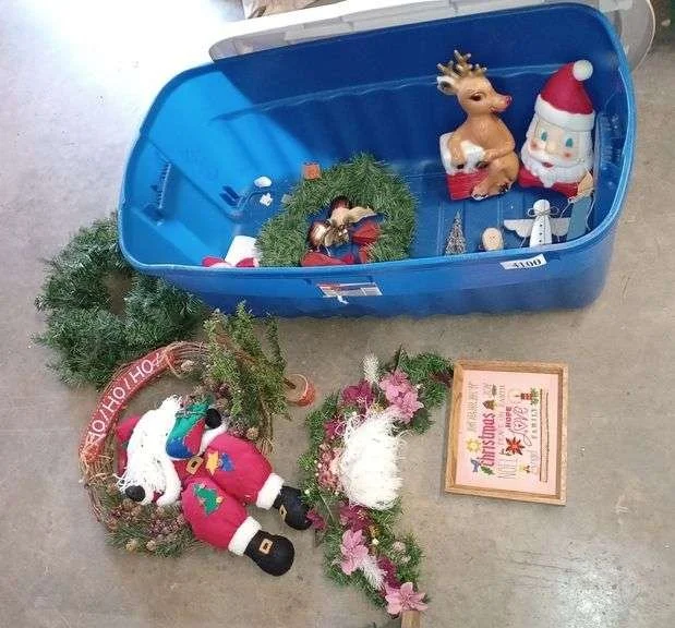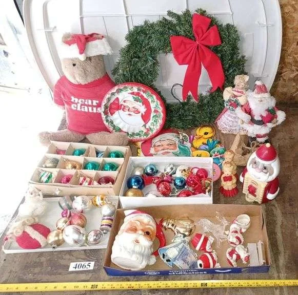 4065 Vintage Christmas ornaments, Christmas decorations, lighted wreath, Etc