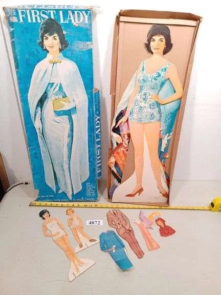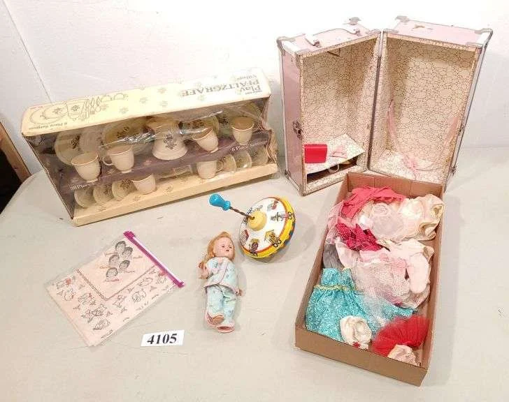 4105 Vintage doll trunk, doll and doll clothes, Dionne quince napkin, Ohio Art Pfaltzgraff plastic play set, top