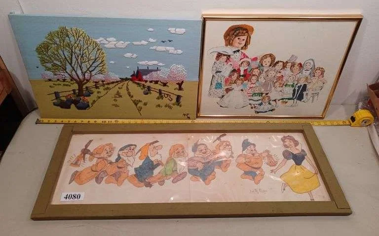 4080 Framed Snow White and the Seven Dwarfs drawing, needlepoint, framed paper dolls