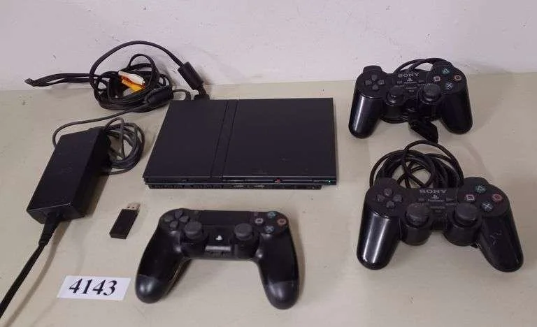 4143 Sony PS2 console with wireless controller, 2 wired controllers, 8 MB memory card, etc