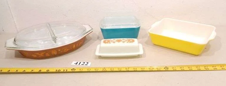 4122 Pyrex baking dishes, refrigerator dish, butter dish