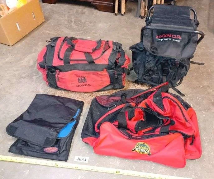 4054 Honda backpack with folding stool, Honda and Cabela's duffle bags, Etc