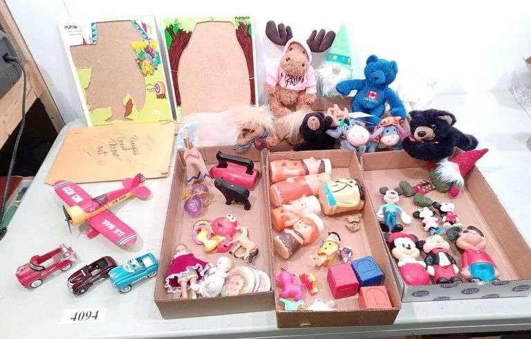 4094 Diecast airplane, pedal cars, Mickey Mouse, Flintstones, and other toys and stuffed animals
