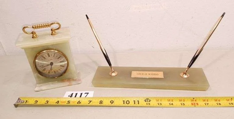 4117 Green stone Kundo clock and Cross pen and pencil holder.