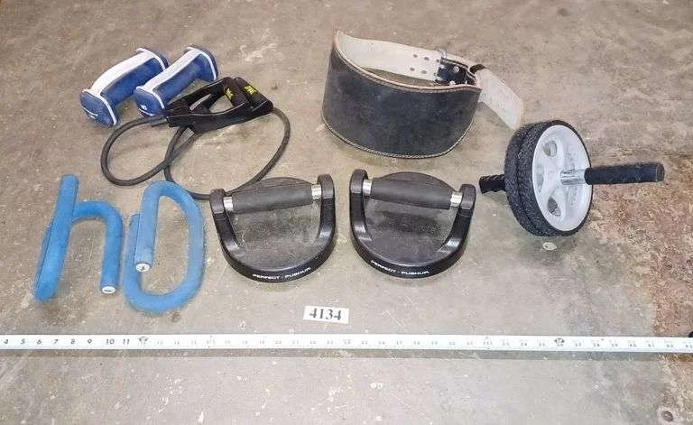 4134 Weights, push-up handles, weight belt, various exercise equipment