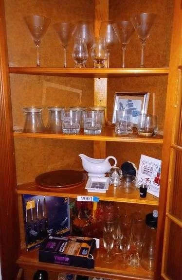 9001 Contents of cabinet including barware, stemware, wine opener, steak knives, etc