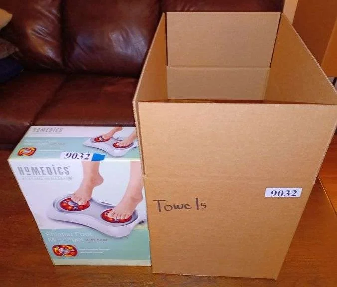 9032 Shiatsu foot massager sealed in box, various bath and hand towels