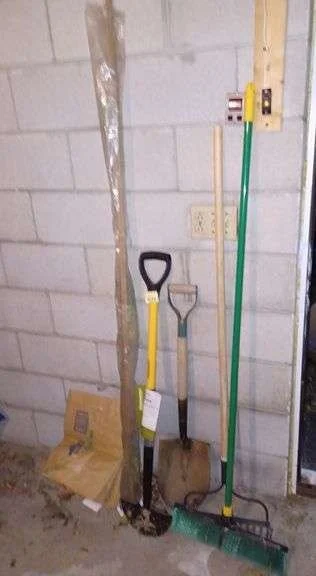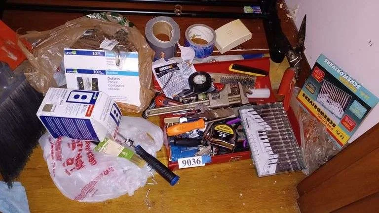 9036 Hand tools, hardware, small red toolbox, electrical outlets, broom, snow shovel, etc
