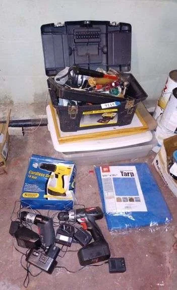 9115 Power tools, hand tools, plastic Stanley tool box, tarp, etc
