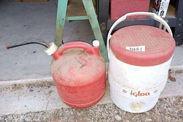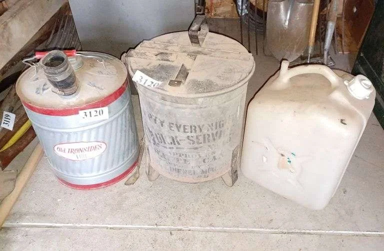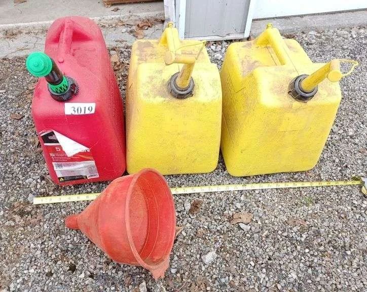 3019 5 gallon gas can, two 6 gallon diesel cans, funnel