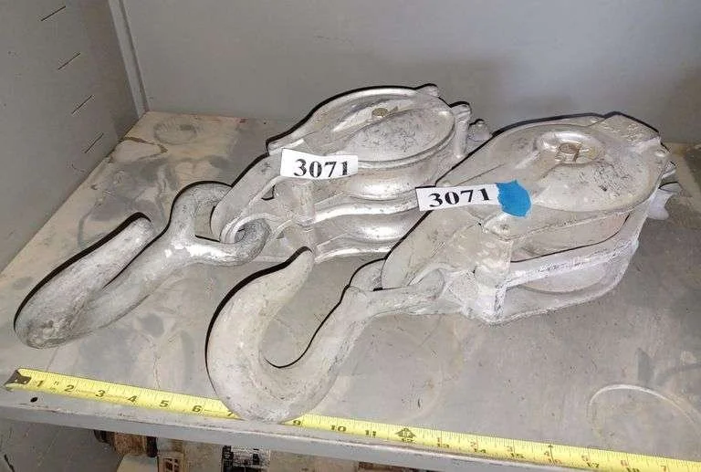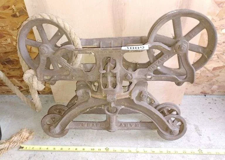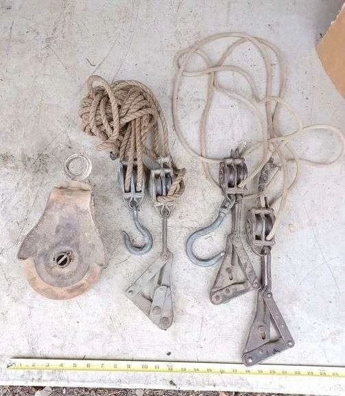 3059 Two Block and Tackle pulley systems, antique wood pulley