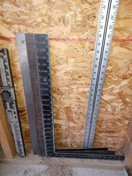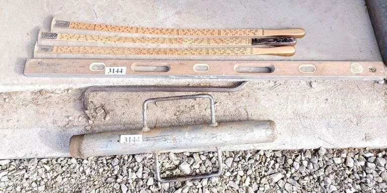3144 (3) Conway-Cleveland Corp lumber rules, Starrett level, post driver, measurers, etc.
