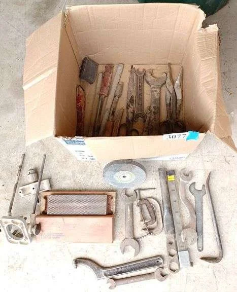 3077 Vintage wrenches, sharpening stone, C-clamps, soldering irons, tin snips, Etc