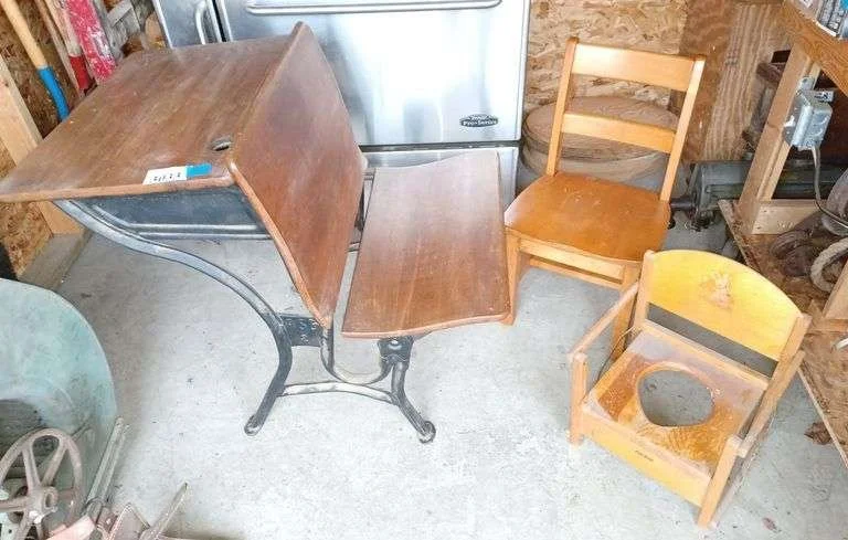 3033 Antique school desk with fold-up seat, vintage child's chair, folding potty chair