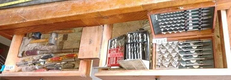 3145 Irwin auger bit set, drill indexes, Hatchet hammer, rubber mallets, other hand tools