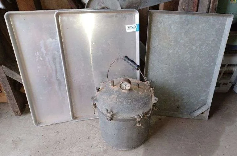3089 Vintage National No. 18 pressure cooker, two sheet trays, double handled galvanized tray